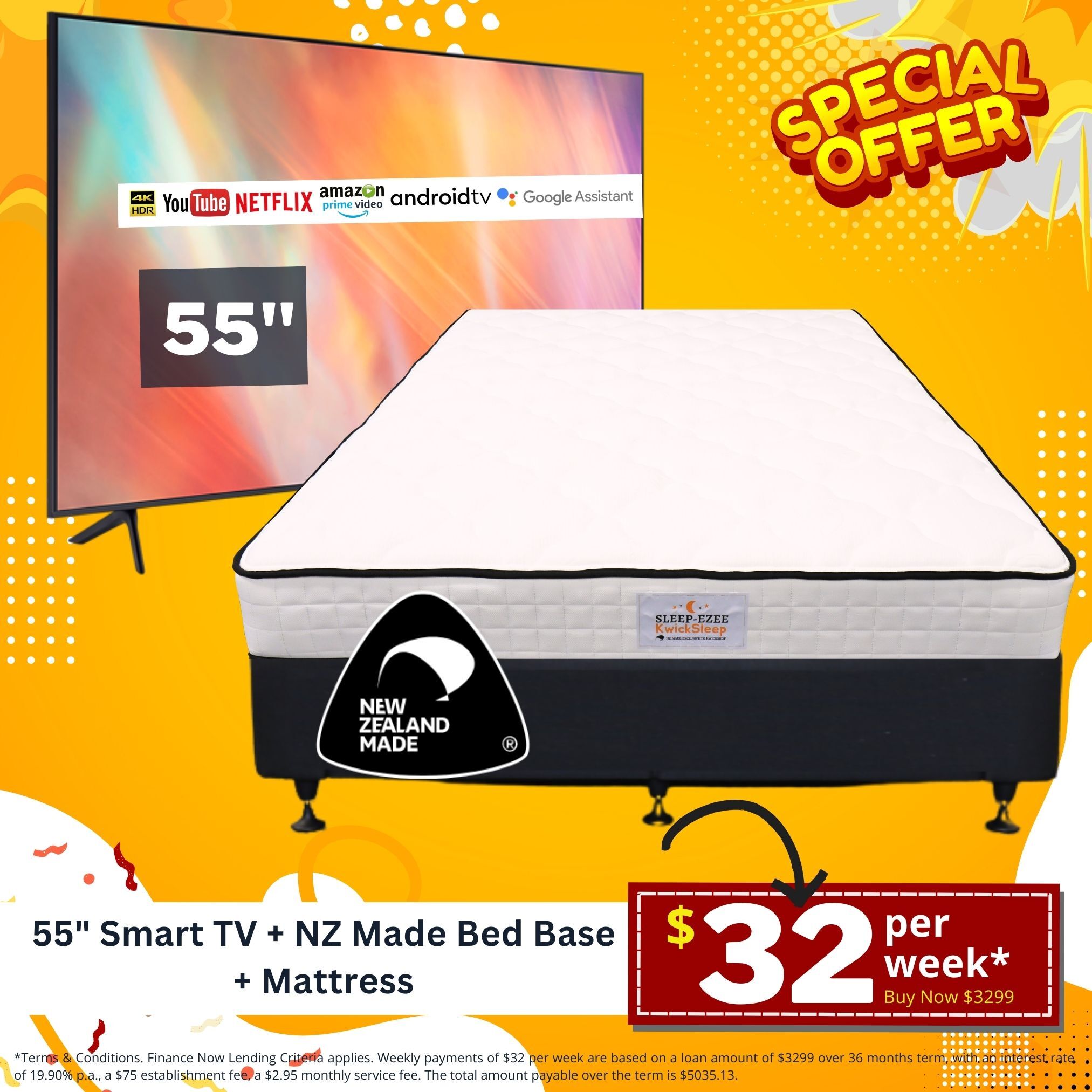 *Terms & Conditions. Finance Now Lending Criteria applies. Weekly payments of $32 per week are based on a loan amount of $3299 over 36 months term, with an interest rate of 19.90% p.a., a $75 establishment fee, a $2.95 monthly service fee. The total amount payable over the term is $5035.13.